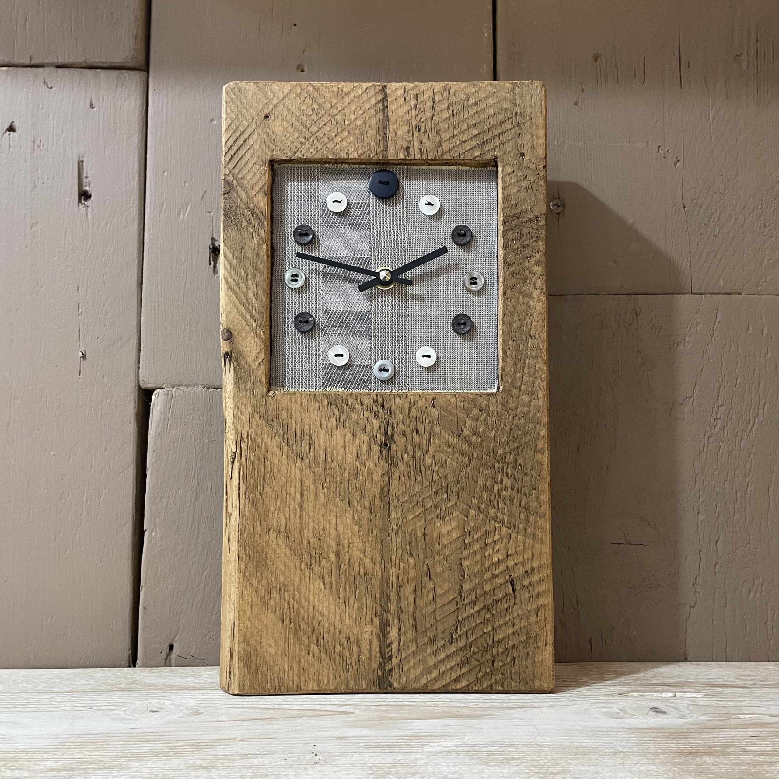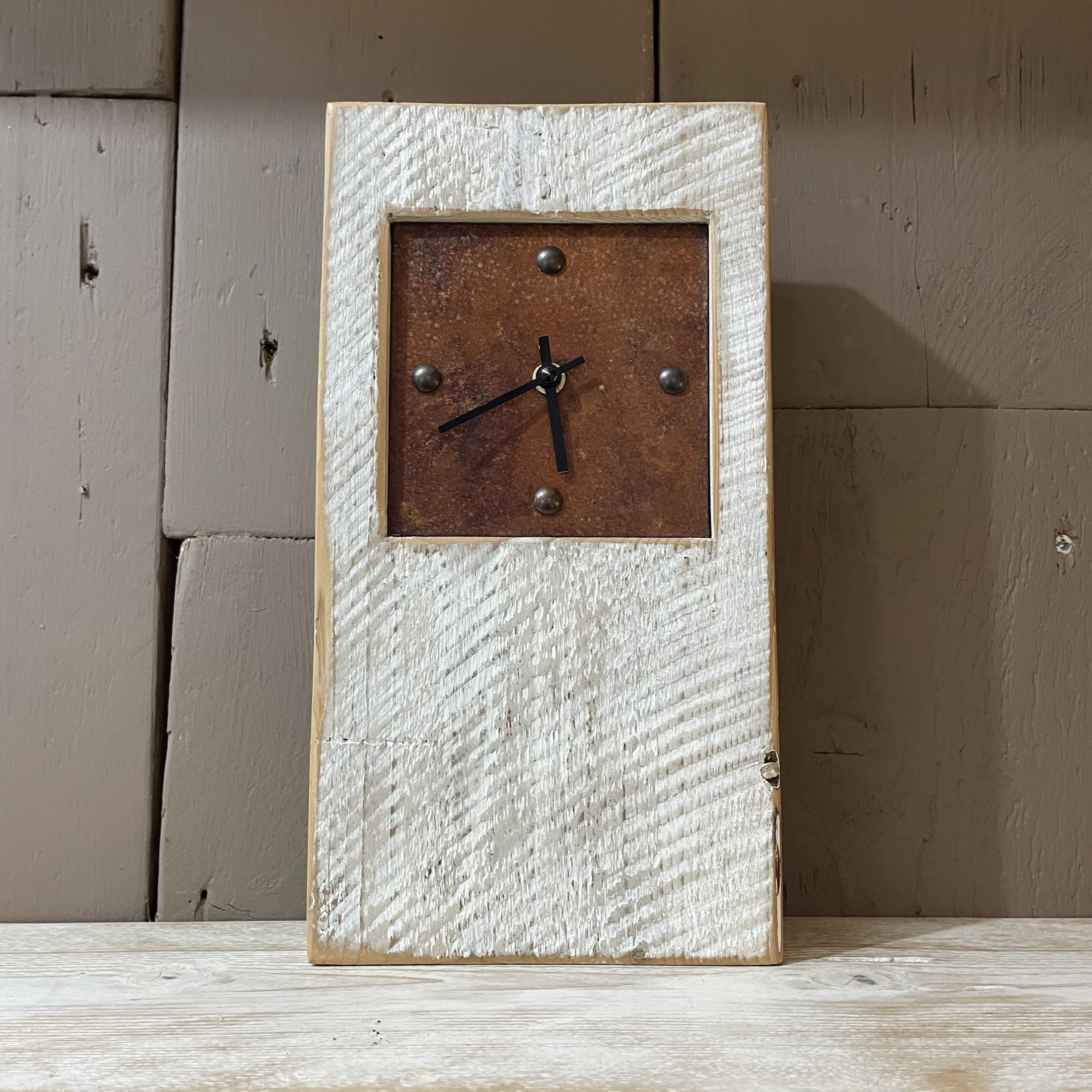 A wall mounted or free standing clock made from reclaimed timber. Includes a cream crackled painted clock face together with 12 upholstery pins as numbering, or a rusted steel clock face together with 4 upholstery pins as numbering.