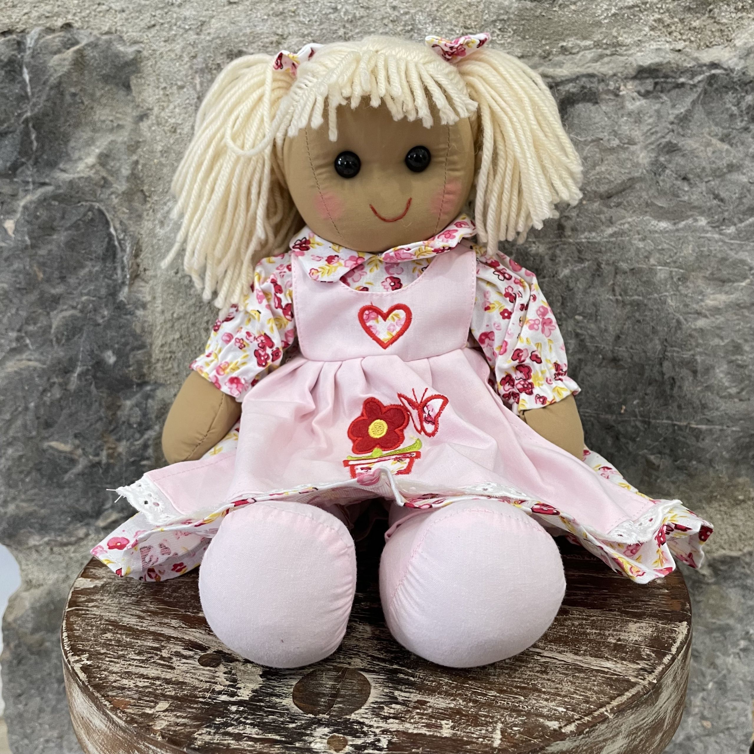 Beautiful dolly wearing her blonde hair in bunches with bows. Her pretty floral dress is worn under a pink apron appliquéd with an embroidered butterfly, heart and a flower in a pot. Her outfit is completed with lace trimmed bloomers and pale pink strapped shoes.
