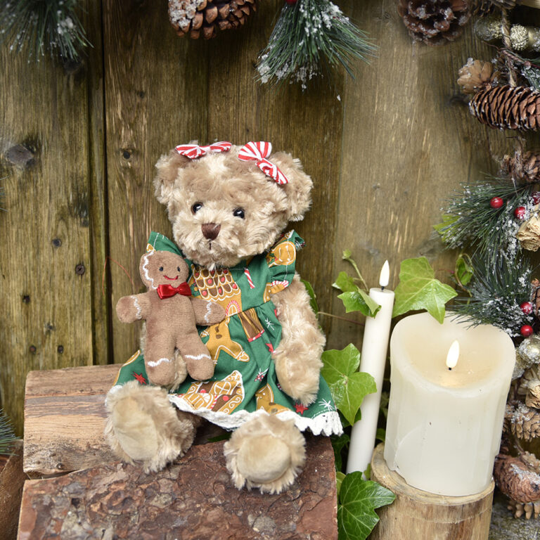 Slightly shaggy and delightful to cuddle, this super soft bear has velvety paws, fixed eyes, jointed limbs, and an embroidered mouth and nose. Teddy wears a beautiful cotton removable dress in our new gingerbread man and gingerbread house print. A stylised mix of gingerbread houses, gingerbread men, Christmas puddings, biscuits and candy canes on a Christmassy green background. The dress is trimmed with crochet lace on the hem. She has candy cane bows on her ears and carries her own little velvety gingerbread man embroidered teddy bear which has a sweet little bow tie.